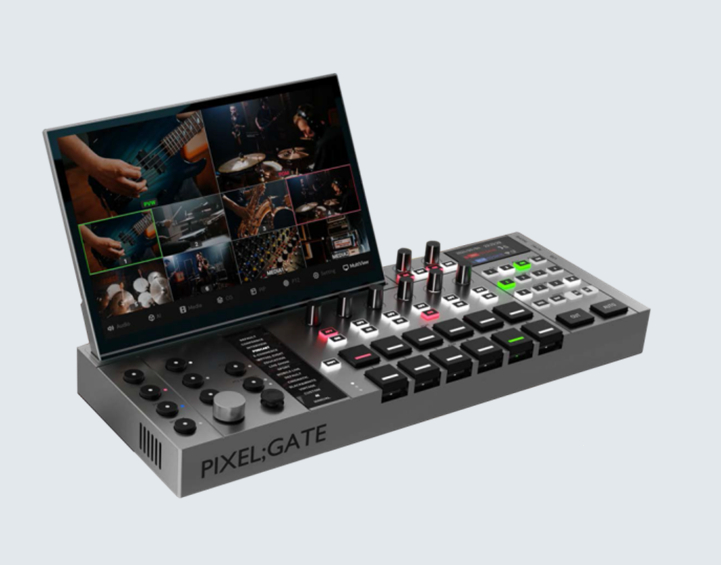 Pixel Gate 4K AI直播导播一体机采用全金属铝合金外壳, 一体机式模块化设计。导播台配备机械轴体按键,提供极佳  的触感反馈。导播一体机集成配置10.1英寸高清高亮触控屏幕,通过触屏即可完成导播台的操作应用。导播一体机 可应用于视频信号切换、网络直播、嘉宾连线、多通道录制、字幕叠加、LUT校色、AI智能识别、语音转写和会议 总结等,满足各类用户的全方位节目录制直播需求, 为新闻制作、校园活动直播、专家访谈、视频会议、大型会议 直播和课程录制等全场景应用提供一体化解决方案。