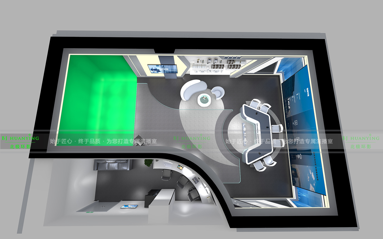 虚拟抠像区可以展现产品及各类活动,根据节目的需求通过我司自主研发的4K虚拟演播室系统更换不同的背景。