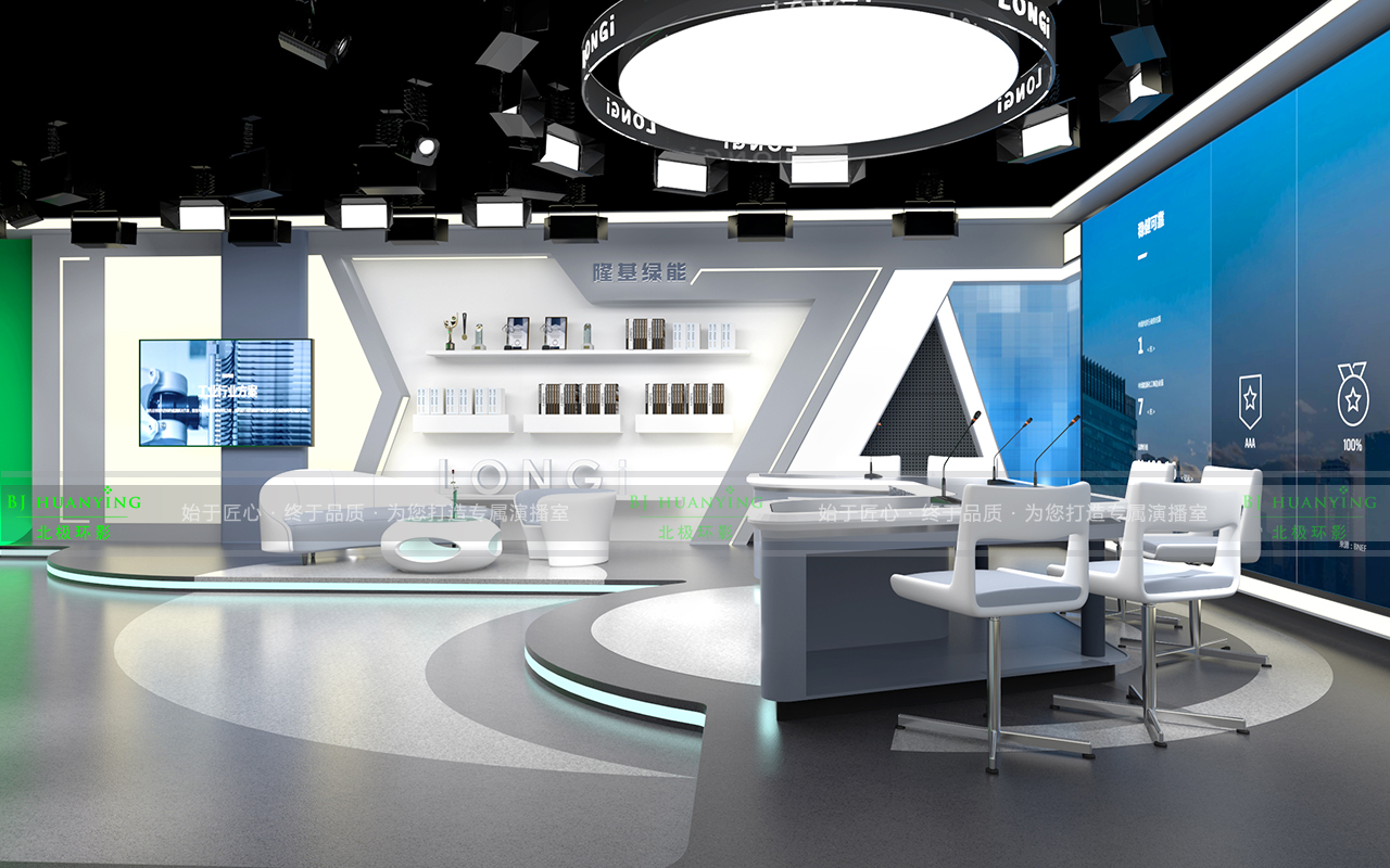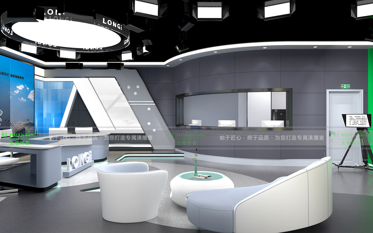 隆基股份全媒体演播室是集新闻制作、电视访谈、微课制作、虚拟拍摄等节目为一体的专业类综合演播室。在不失节目稳重的同时,又体现了演播环境的艺术品位,让节目与演播浑然一体是本建设的根本。本项目面积约110平米,施工周期70天,时间紧、任务重,我司在系统设计方案中充分满足隆基股份全媒体演播室节目制作的实际和发展需求,在设备选型及方案设计的整体性、先进性、可行性及安全性均具有独特的理念。